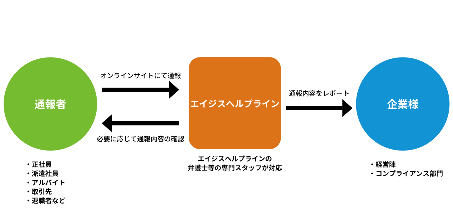 - ④エイジスヘルプラインの弁護士等の専門スタッフが通報内容を纏め、クライアント企業様の担当部署への報告を行います。